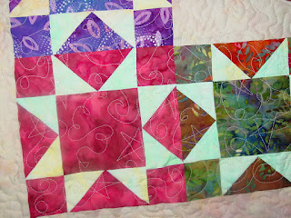This is the first quilt I have quilted on the new "Beast." I didn't like it and was going to just let it sit, but now it has a little special meaning. You can see the stippling (the beige area - just meandering), and the stars and loops on the squares. The bright colored print is the back of the quilt. Next is my 'king' size!